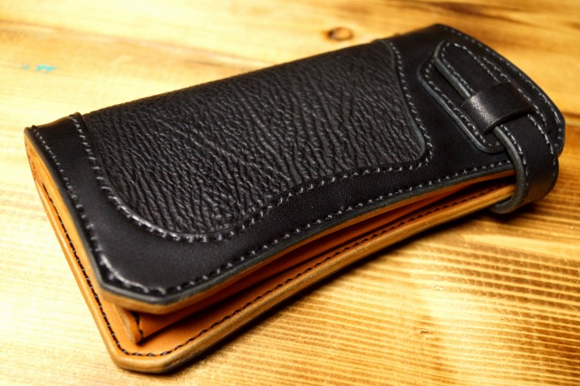 ブラックサドルレザーにシャークスキン(鮫革)をインレイしたロングウォレット。ブラックで統一された表革とは対照的に、内革は若々しさを感じるキャメルカラー。クールでお洒落なシャークスキンロングウォレット。