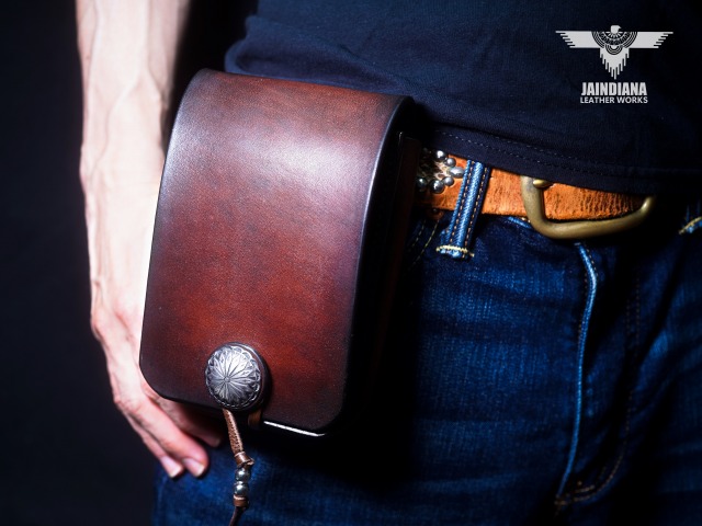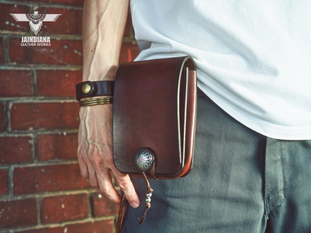 手染めによりビンテージ感あるディープブラウンカラーに染め上げたサドルレザーを一針一針手縫いで仕上げたメディスンバッグ。シンプルで丈夫な作りと、がっちりベルトに装着できる便利さが魅力の使う者に寄り添うメディスンバッグ。