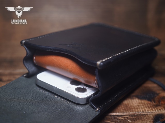 スマートフォン収納に最適な、重厚感あるサドルレザーメディスンバッグ。