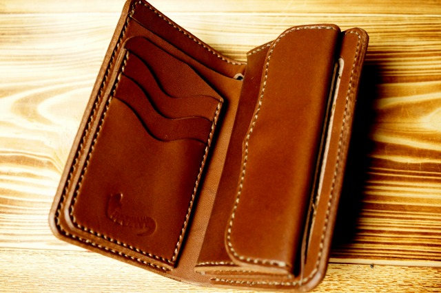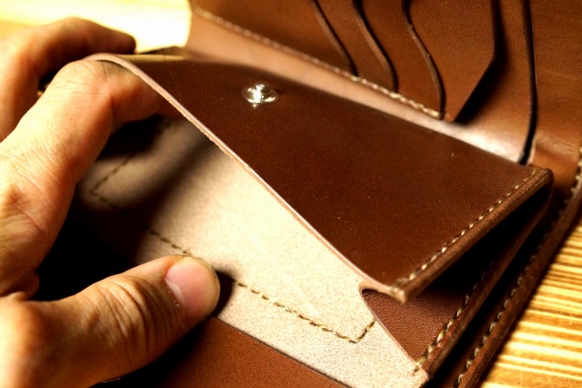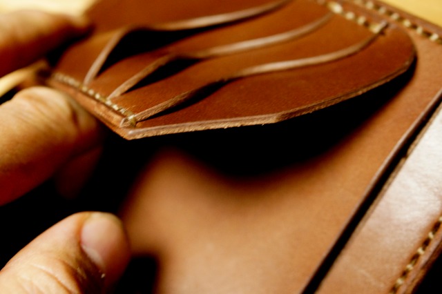 革と手縫いの相性は抜群で、財布として構成された革を骨のように屈強にささえ、血液のように脈々とアウトラインを流れます。