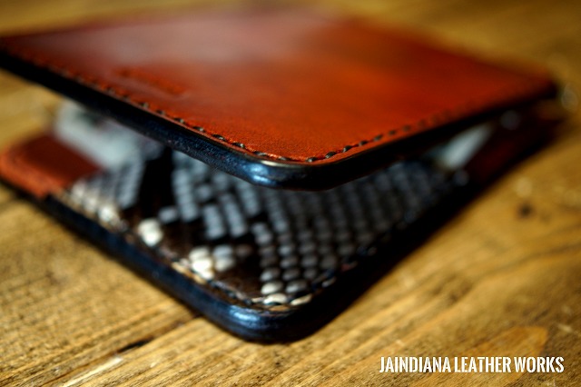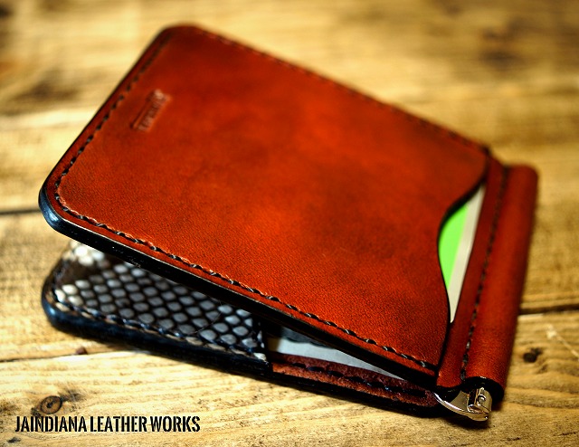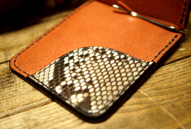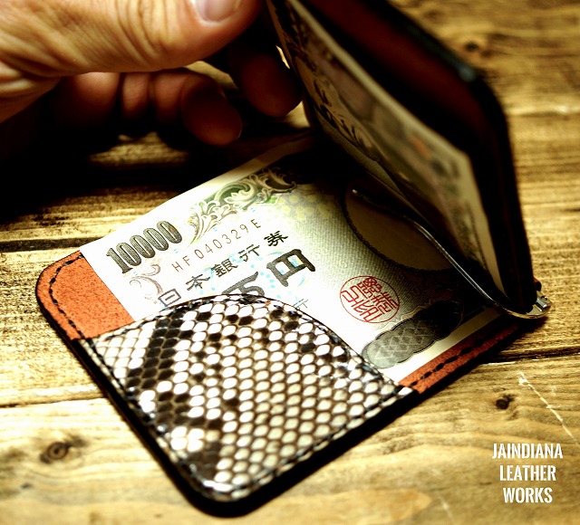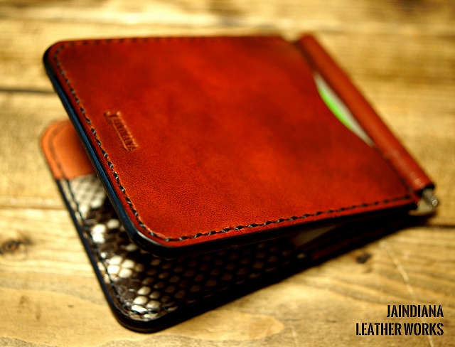 手染めによりクールでエネルギッシュなビンテージバーガンディーに染められたサドルレザーマネークリップ。内側に配置されたパイソンが、更に能動的な印象を与えるJAINDIANAの傑作マネークリップ。
