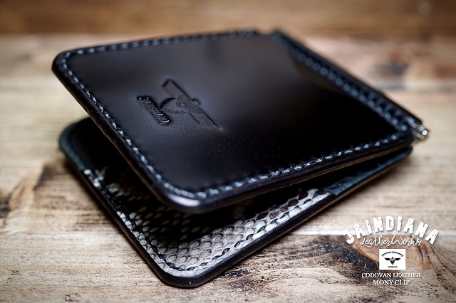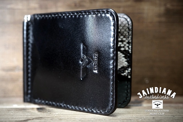 きめ細やかでしっとりとした質感と高級感ある美しい艶を放つシェルコードバンを使用し手縫いで仕上げたマネークリップ。内側に配置されたパイソンが、個性と能動性を加えたJAINDIANAの傑作マネークリップ。