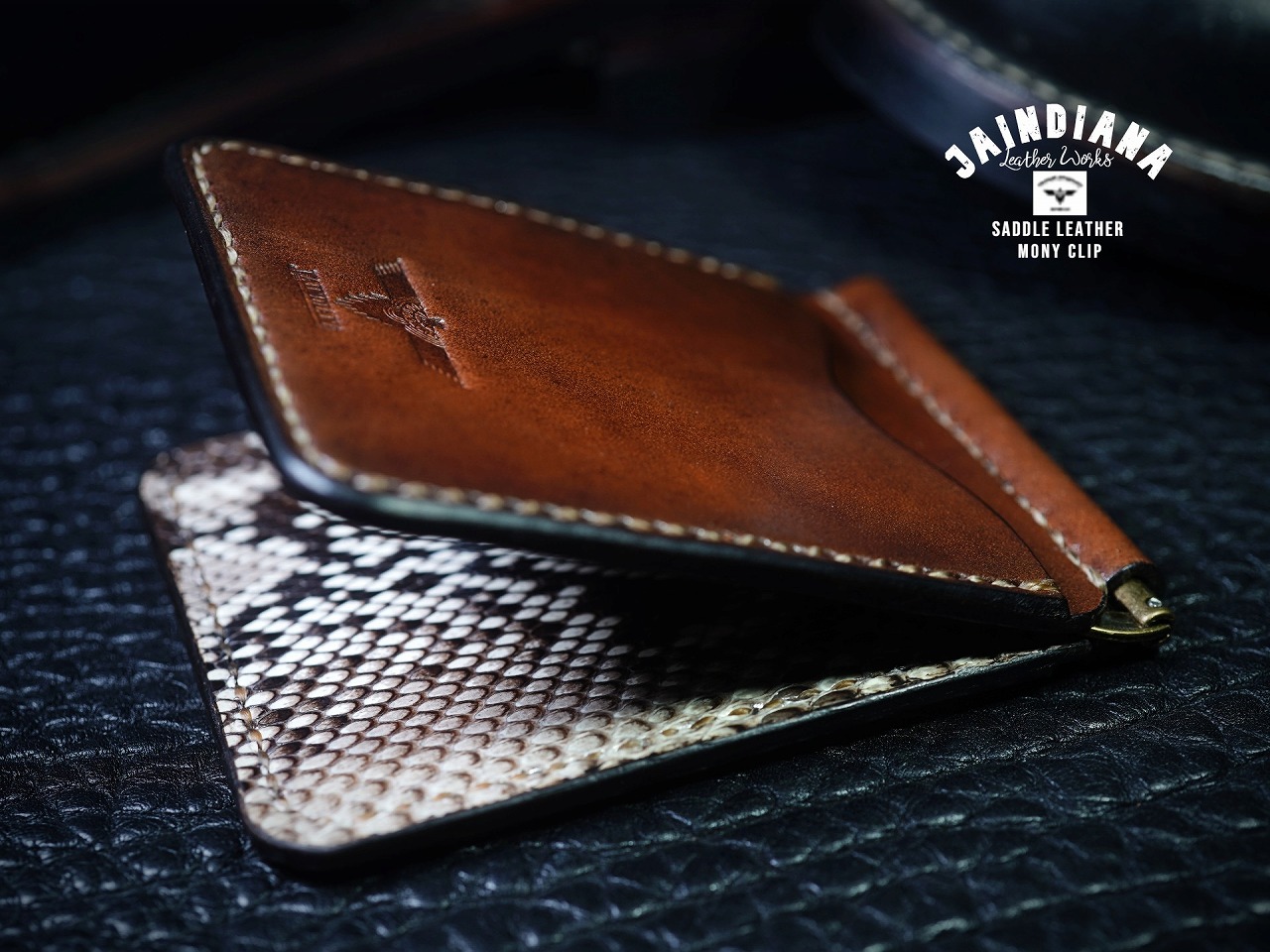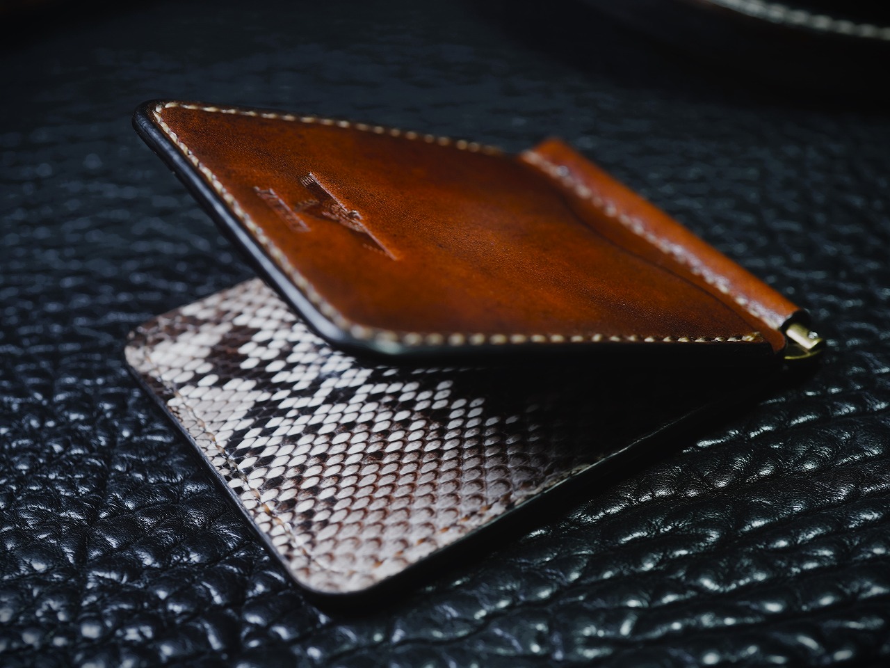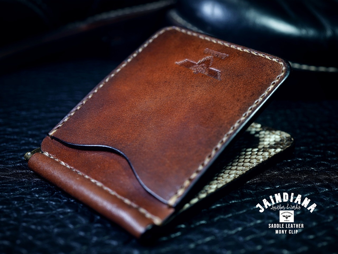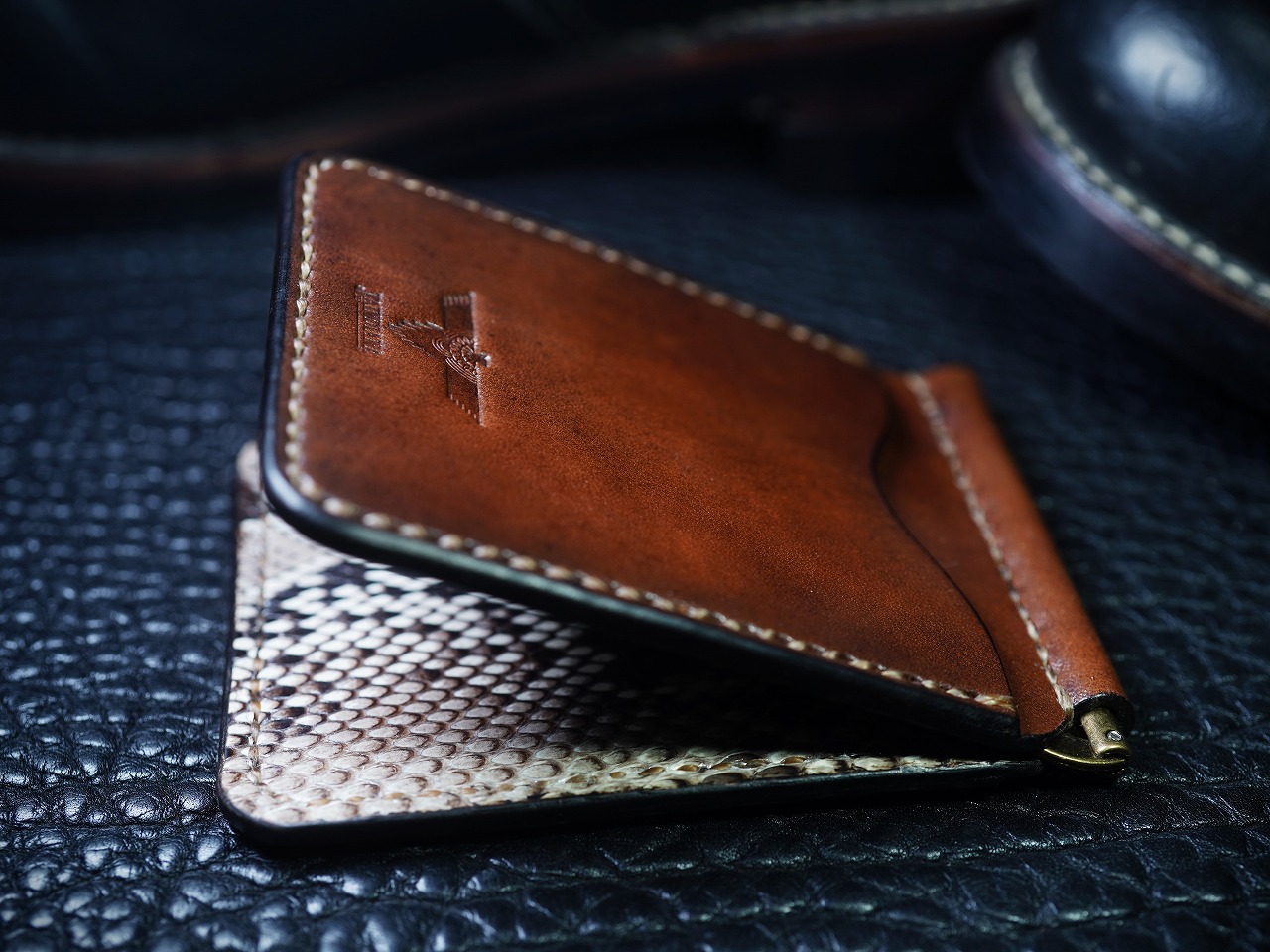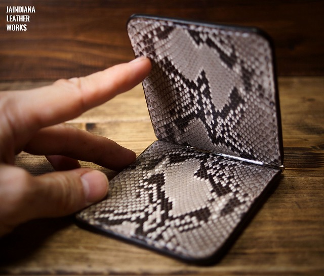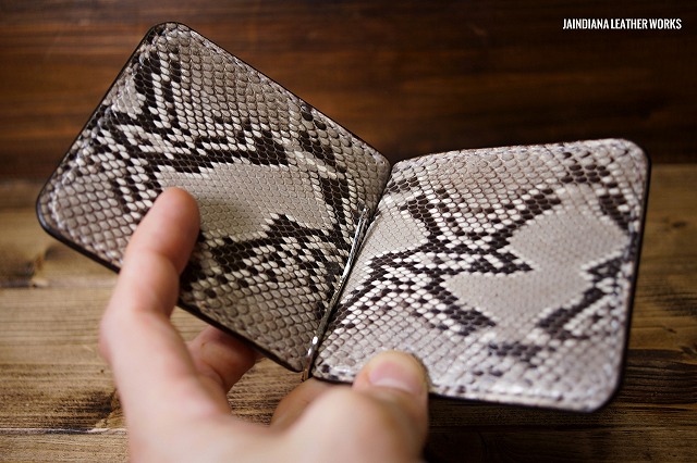 手染めにより深みのある能動的なビンテージブラウンに染められたサドルレザーマネークリップ。内側にはパイソンが大胆に配置され、クールなパワフルさを加速させる傑作マネークリップ。