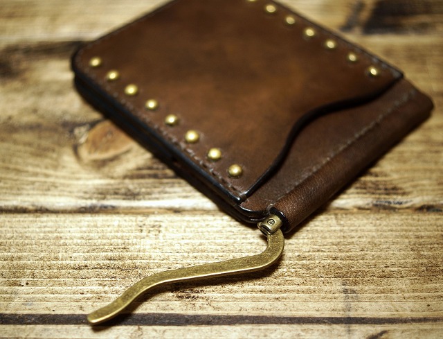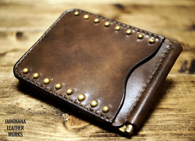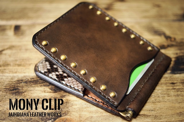 手染めによりクールで渋いビンテージブラウンに染められたサドルレザーに真鍮製スタッズを打ち込んだマネークリップ。内側に配置されたパイソンがエネルギッシュさを秘めるJAINDIANAの傑作マネークリップ。