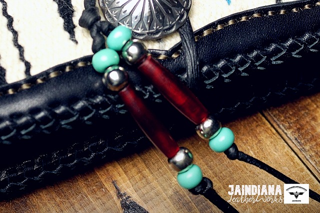 その革紐にバッフアローの角で作られたホーンパイプとターコイズブルーのガラスビーズを取り付けています。