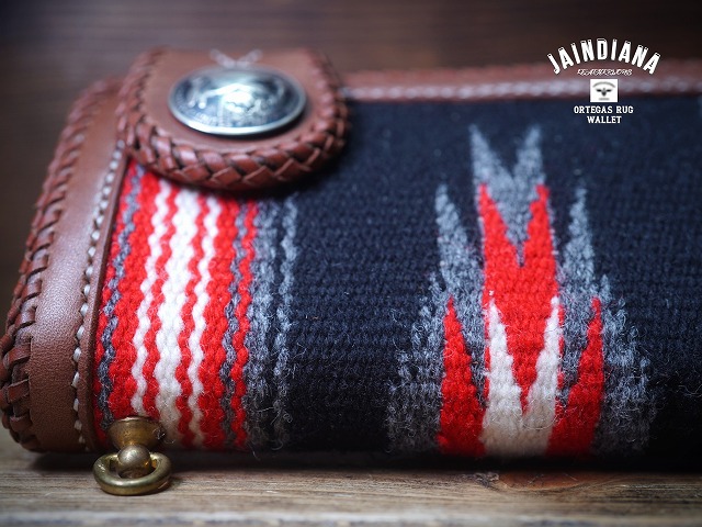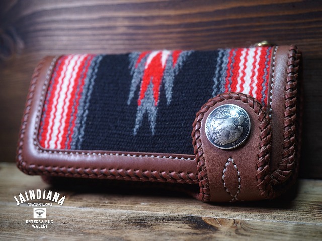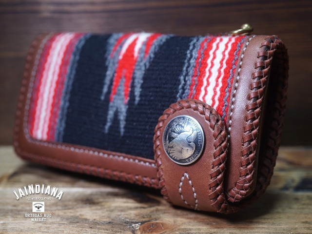 ブラックベースにレッドのライン模様が、オルテガらしいネイティブでエネルギッシュな魅力を放つロングウォレット。シルバーのイーグルコンチョがフラップデザインとマッチし、ウォレットの重厚感を演出する極上長財布。