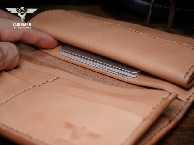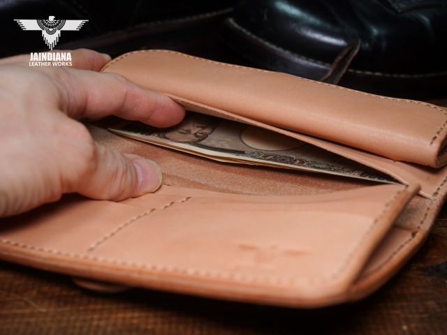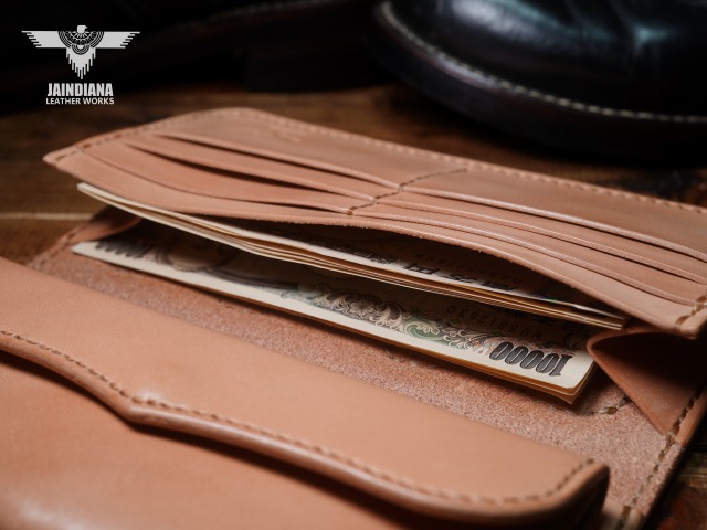 革と手縫いの相性は抜群で、財布として構成された革を骨のように屈強にささえ、血液のように脈々とウォレットラインを流れます。