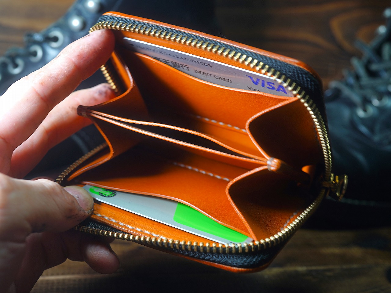 革と手縫いの相性は抜群で、財布として構成された革を骨のように屈強にささえ、血液のように脈々とウォレットラインを流れます。