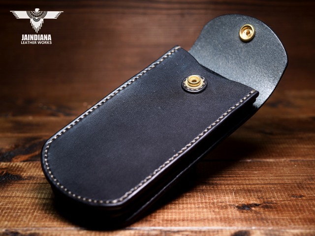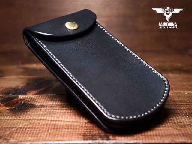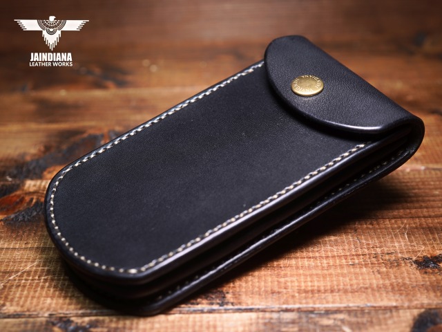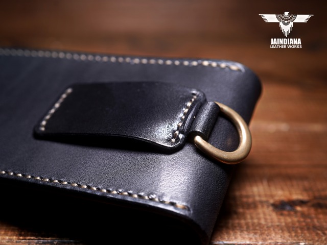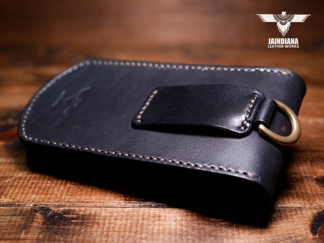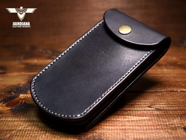 説得力のある重厚感を放つブラックカラーのサドルレザーを一針一針手縫いで仕上げたスマートフォンケース。ワイルドなカッコ良さと、がっちりベルトに装着できる便利さが魅力の使う者に寄り添うスマホケース。