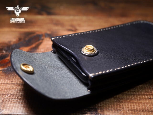 ホック裏には革をかまして縫い付けてありますのでスマートフォンに傷をつける心配はありません。
