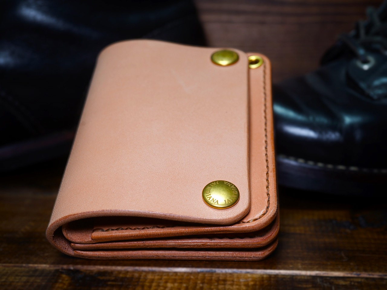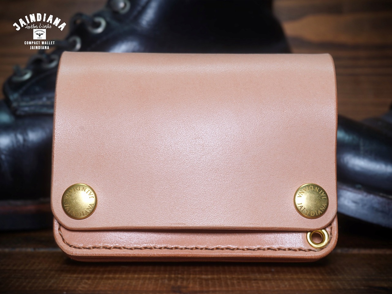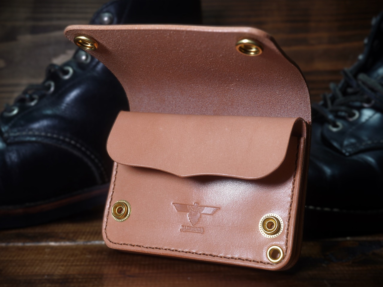 ウォレットロープを取り付けるための真鍮製楕円カンの取り付けが可能です。ご希望の場合はご注文