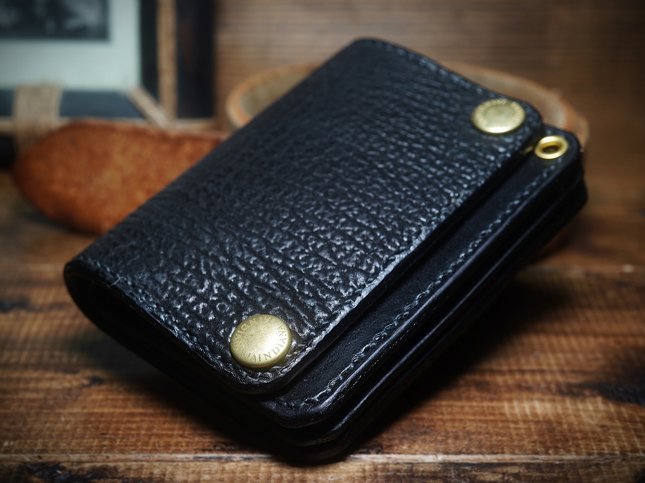 しなやかな肌触りでありながら丈夫な鮫革が、スリムでスタイリッシュなウォレットフォルムに落とし込まれ、洗練された男の魅力と本物の革の重厚感を感じさせる手縫いのショートサイズ・トラッカーウォレット。