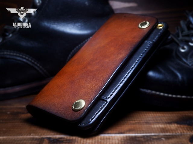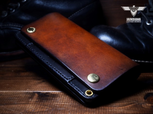 手染めによりビンテージ感あるブラウンに染め上げられたサドルレザーとブラックサドルレザーのコントラストが、スタイリッシュなウォレットフォルムに深みのある大人の魅力と本物の革の重厚感を感じさせる手縫いのトラッカーウォレット。
