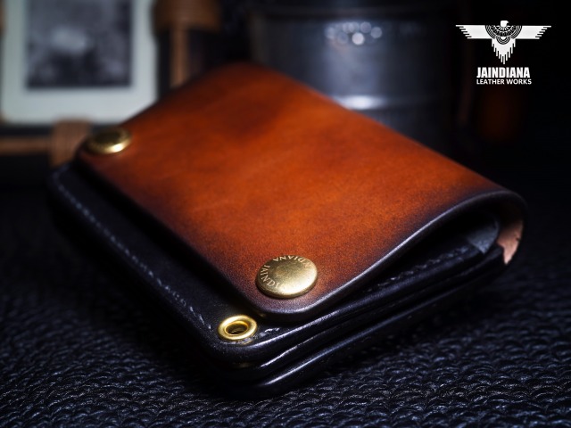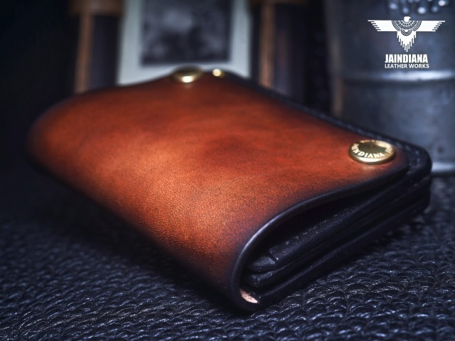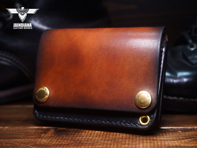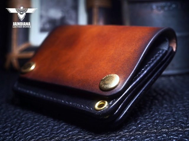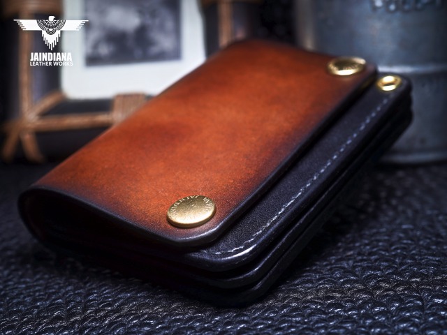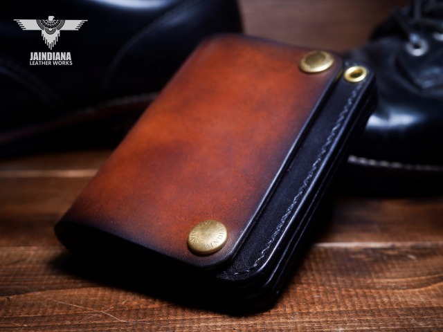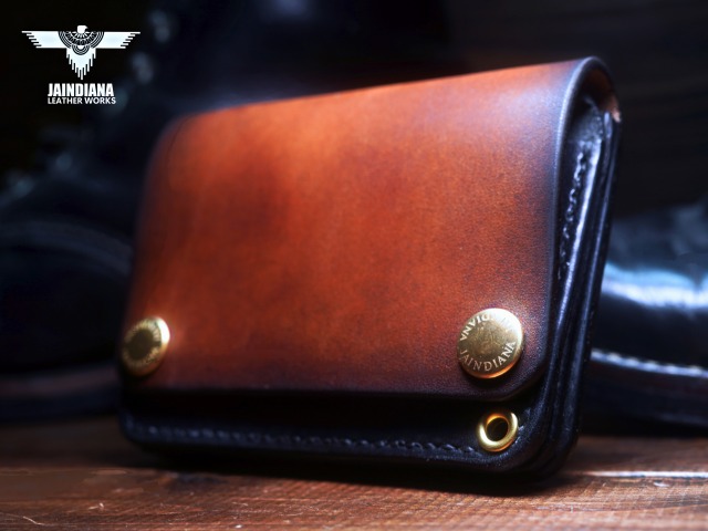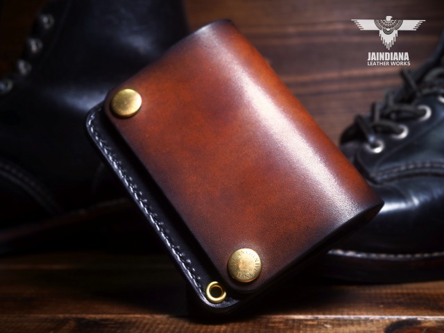 手染めによりビンテージ感あるブラウンに染め上げられたサドルレザーとブラックサドルレザーのツートンカラーが、スタイリッシュでコンパクトなウォレットフォルムに深みのある本物の革の重厚感を感じさせる手縫いのトラッカーウォレット。