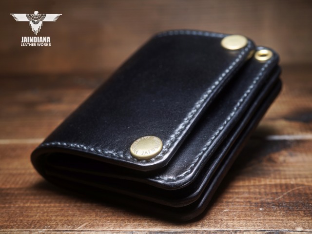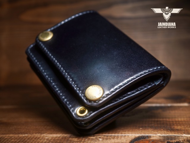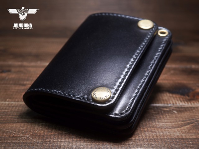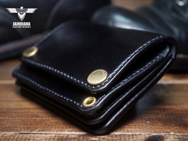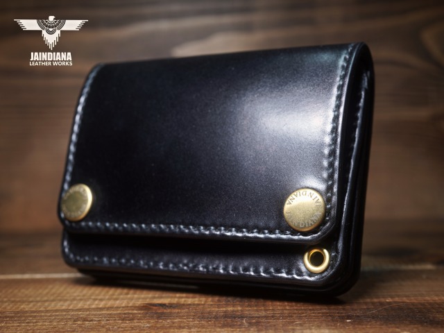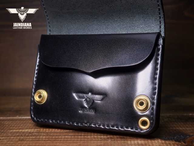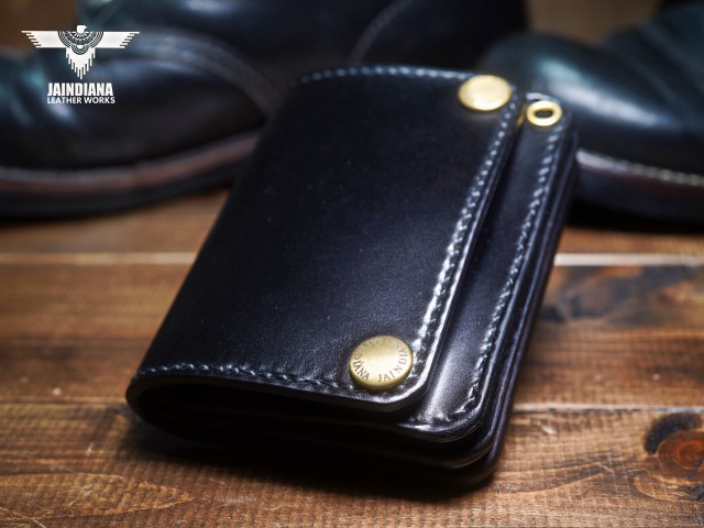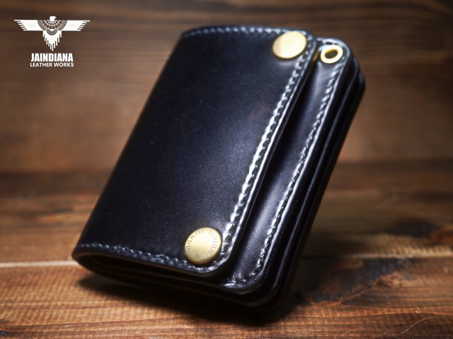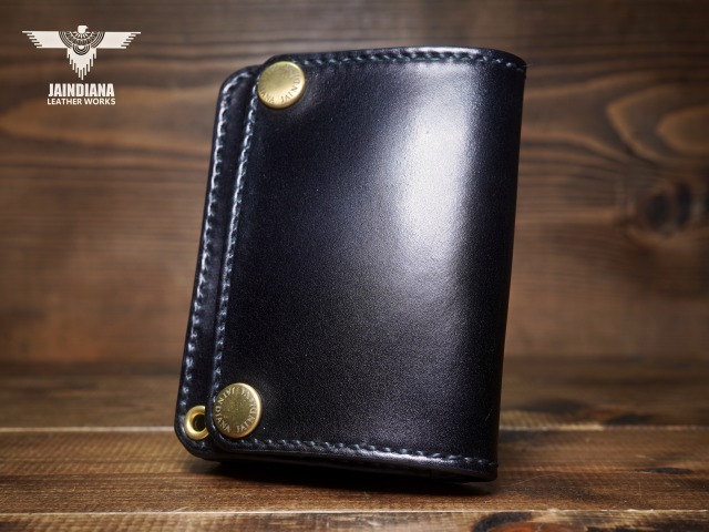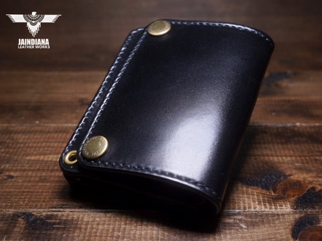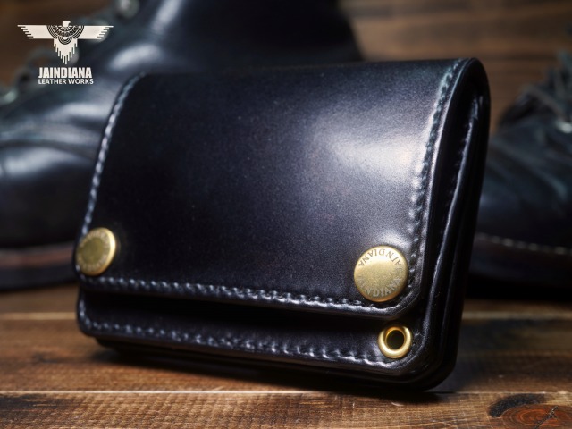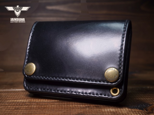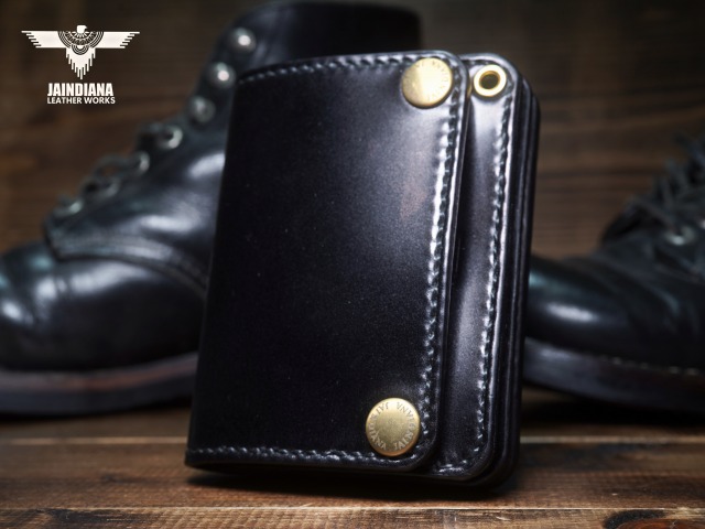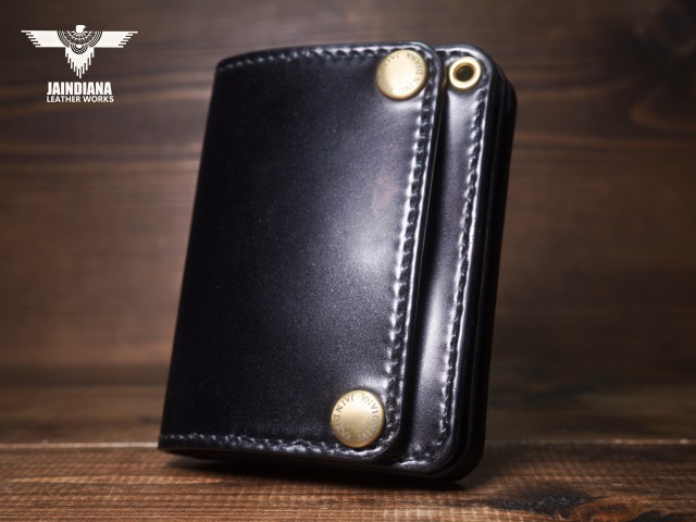 深みのあるシックなブラックカラーにきめ細やかな美しい艶が光るコードバンレザーが、スタイリッシュでコンパクトなウォレットフォルムに落とし込まれた、本物の革の重厚感を感じさせる手縫いのショートサイズ・トラッカーウォレット。