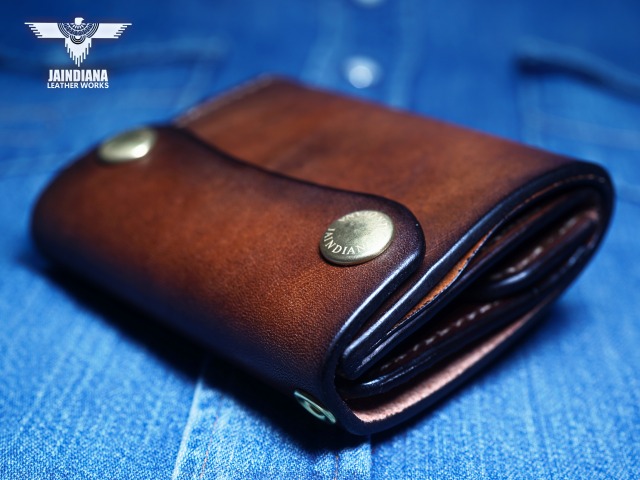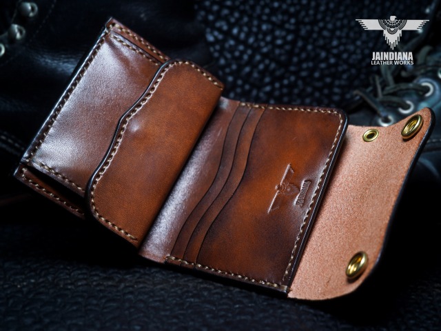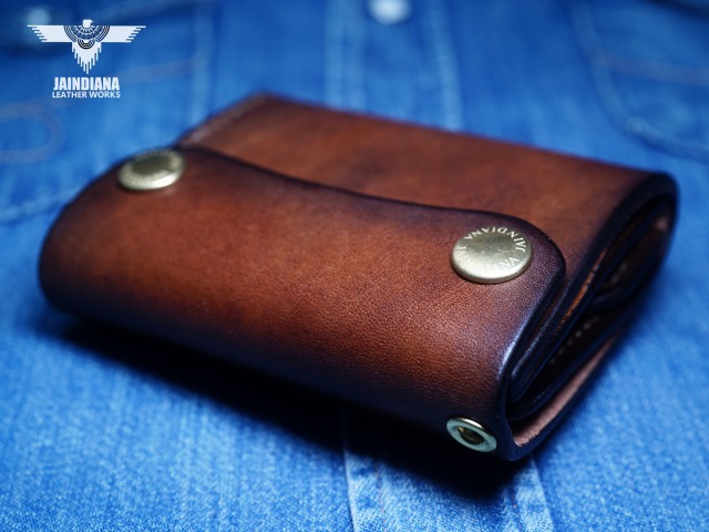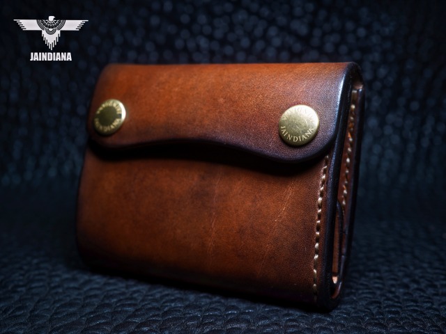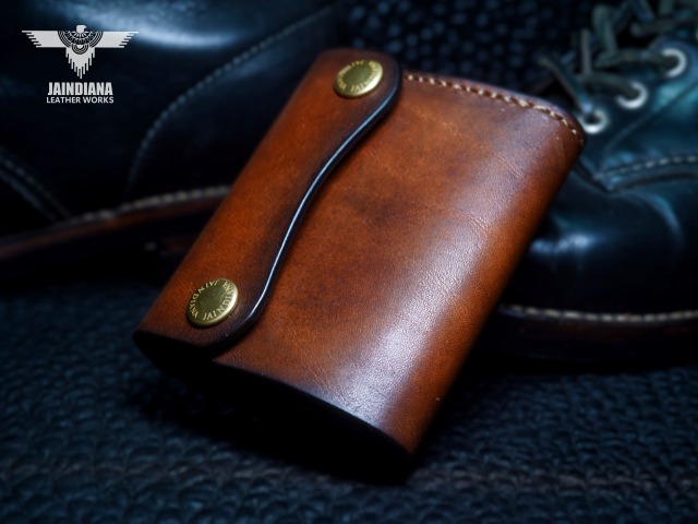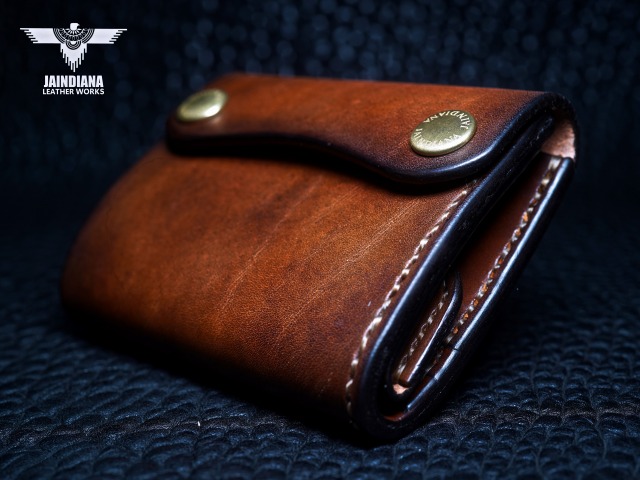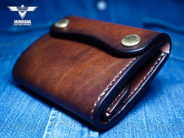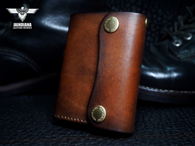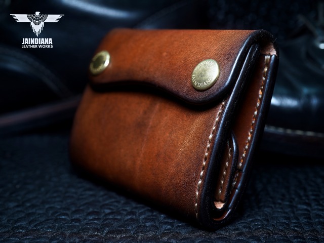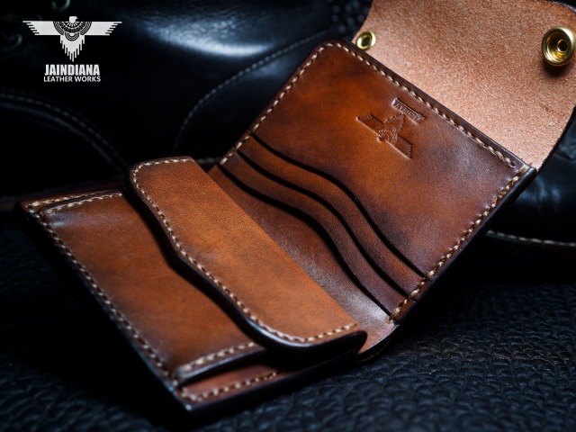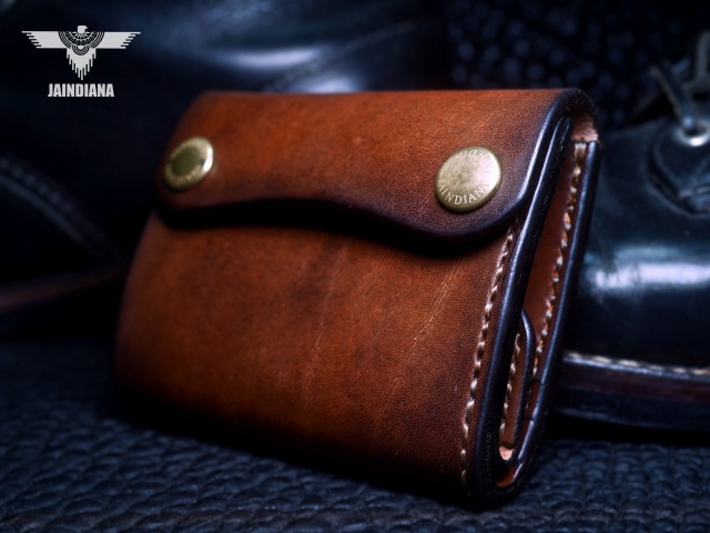 手染めによりビンテージ感あるブラウンに染め上げられたサドルレザーが、スタイリッシュでコンパクトなウォレットフォルムに深みのある大人の魅力と本物の革の重厚感を感じさせる手縫いのトラッカーウォレット。