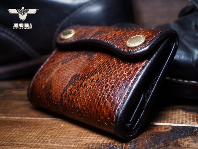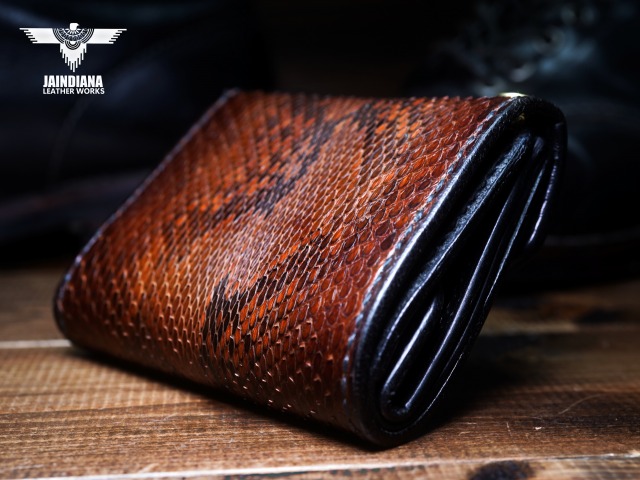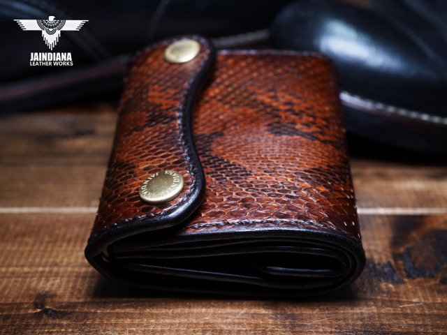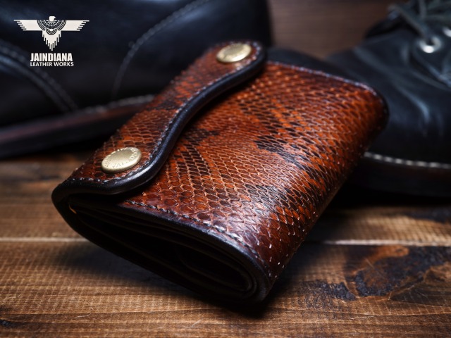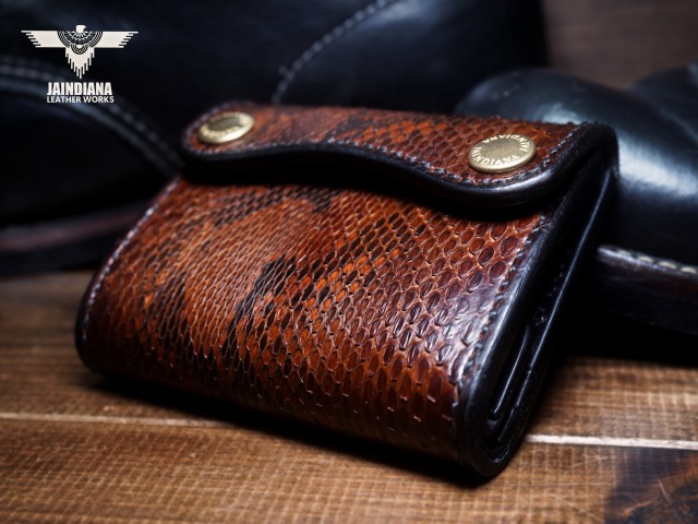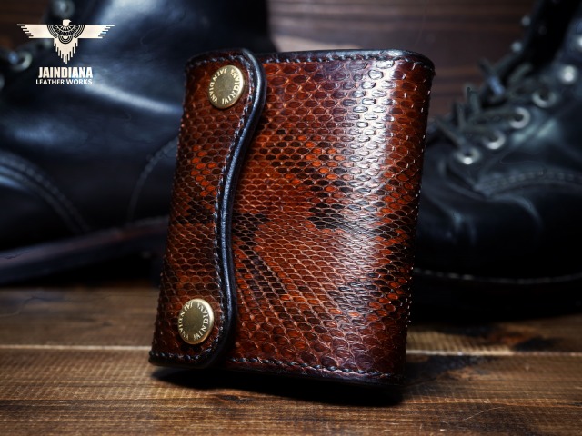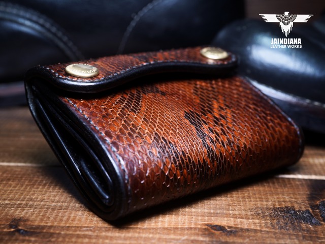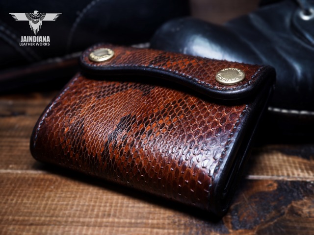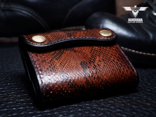 エネルギッシュパイソンスキンを、手染めで丁寧にビンテージ感あるチョコレートブラウンに染め上げ、手縫いで仕立てた極上トラッカーウォレット。