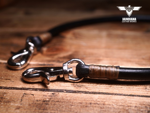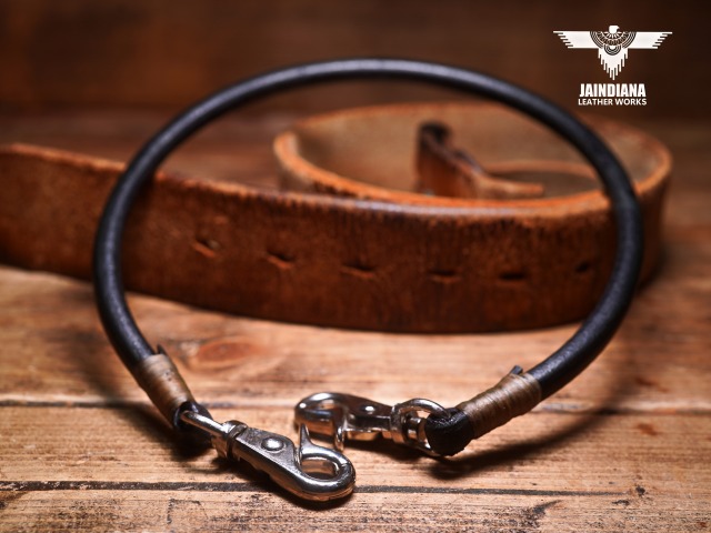 直径9oブラックカラーの丸牛コードを使用し製作したウォレットロープ。利便性とクールさを合わせ持つ、重厚感たっぷりの本物の革の存在感が日常を豊かにするラウンドコードウォレットロープ。
