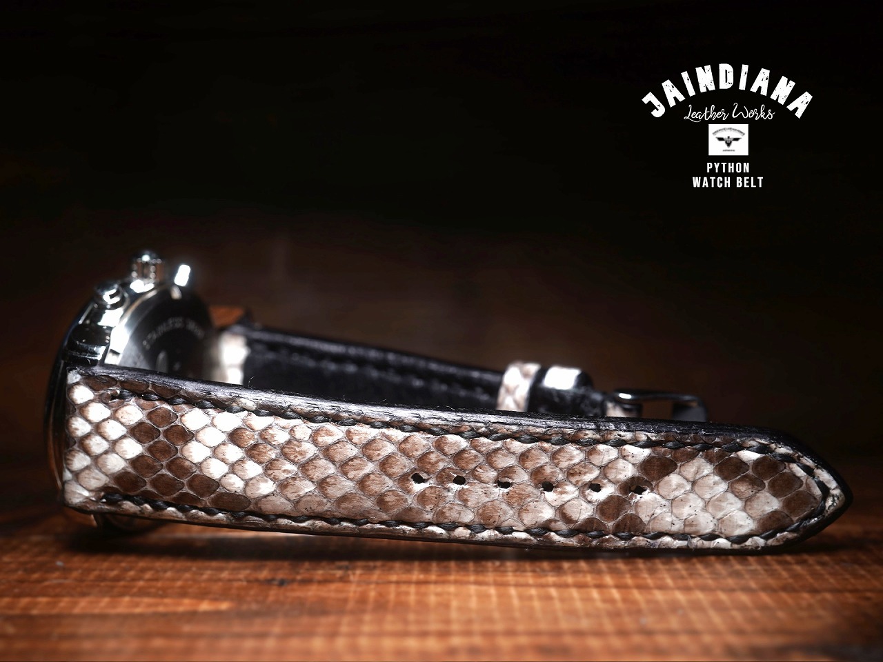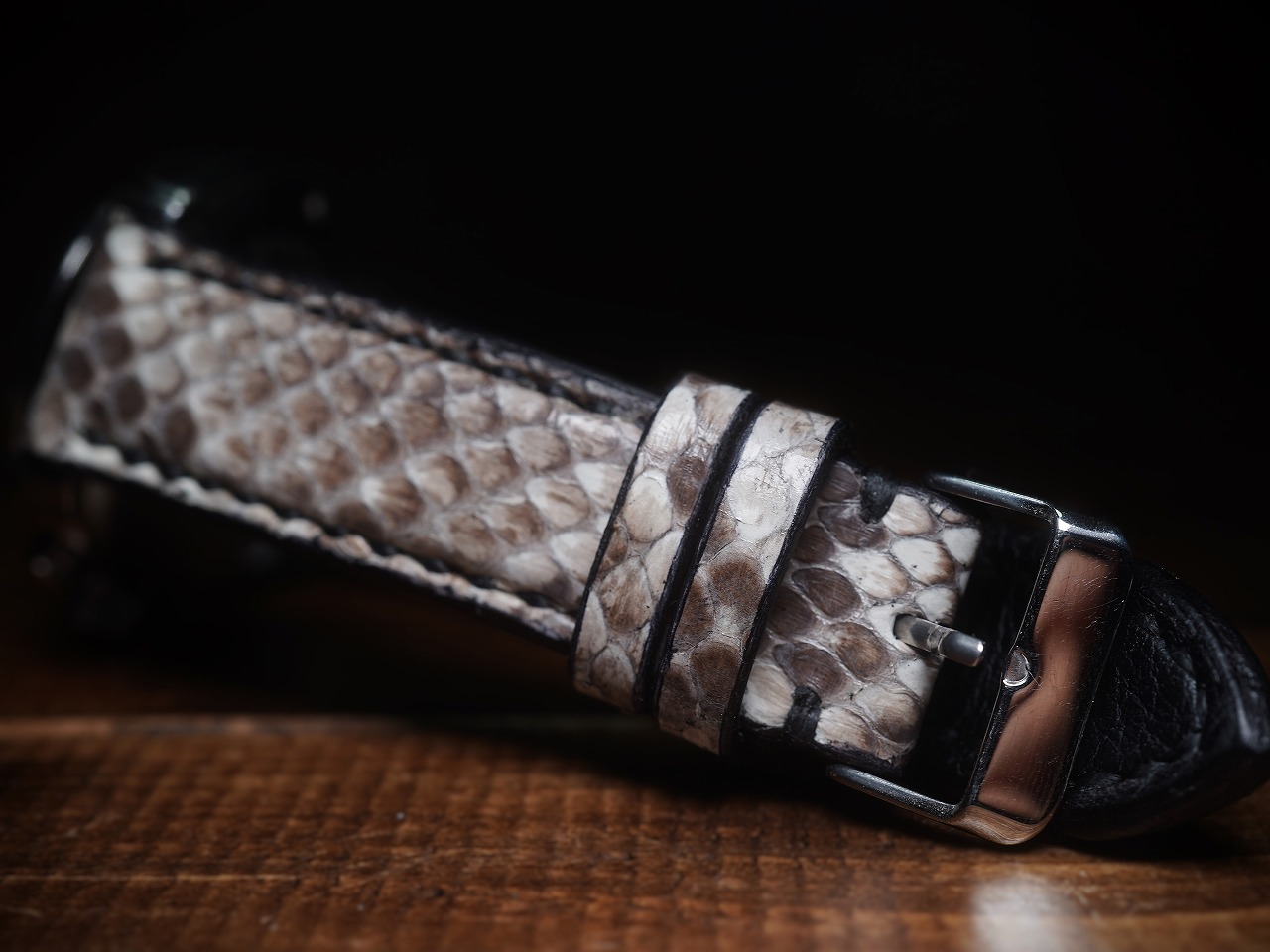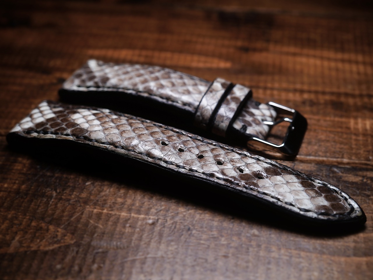 エネルギッシュな鱗模様のパイソンスキンが唯一無二の存在感を放つウォッチバンド。その圧倒的な存在感はパイソンにしか出せない自然演出。日常に特別なエナジーをもたらす手縫いの交換用腕時計バンド。