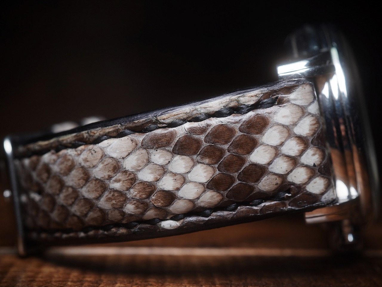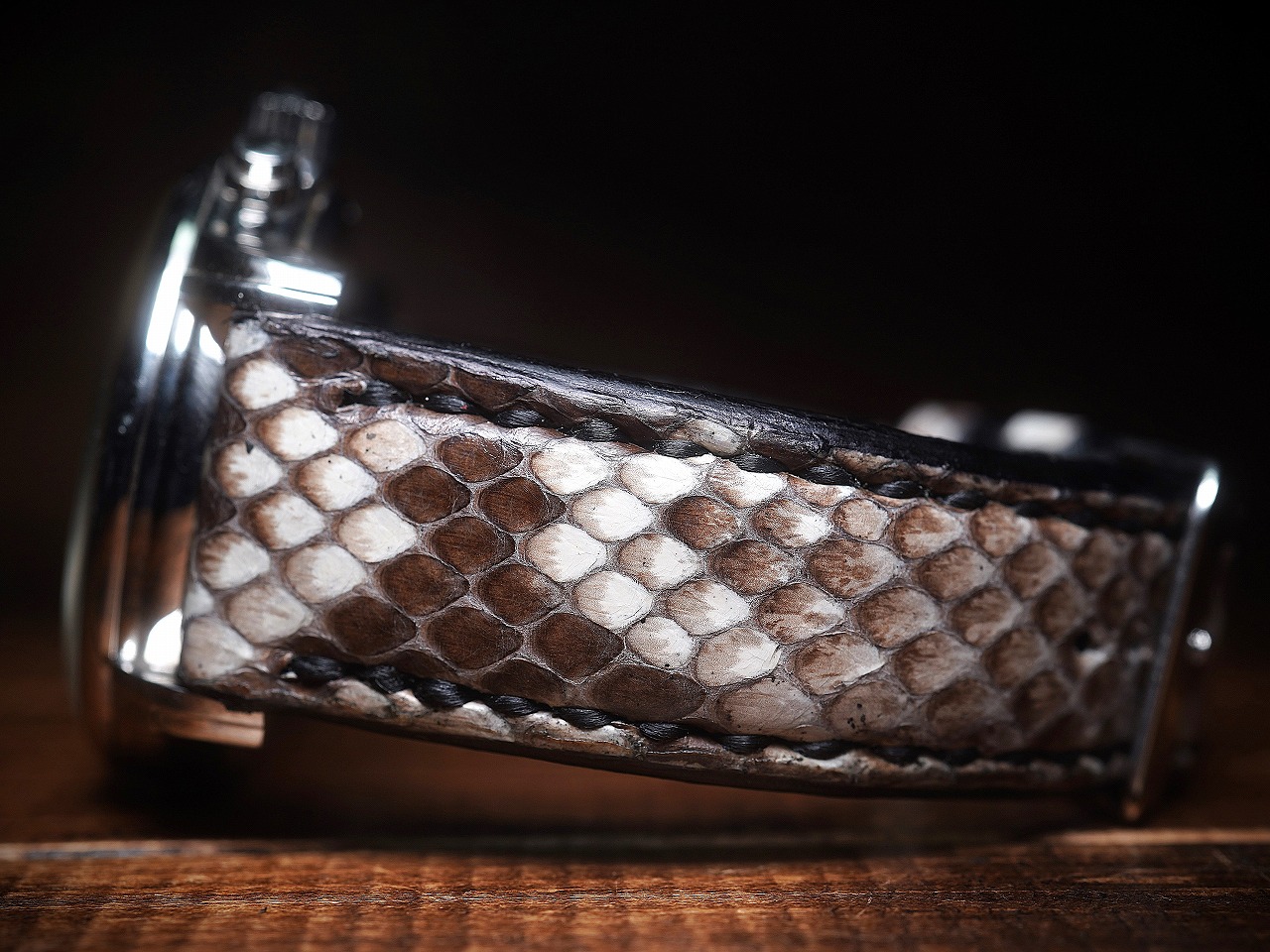 超天然素材であるパイソンスキンが、メタルチックなウォッチフェイスを温かみのある重厚感に変革させる交換用ウォッチベルト。